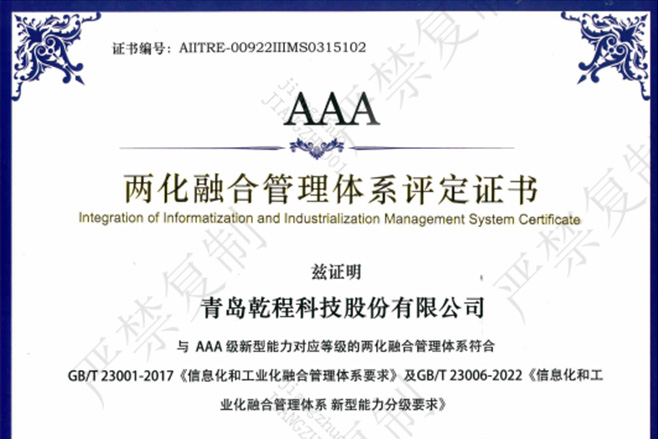 恭喜乾程科技荣获“AAA级两化融合管理体系评定证书”2022-12-15热烈庆祝青岛乾程科技股份有限公司获得“AAA级两化融合管理体系评定证书”,AAA级作为目前国家工信部准许授予的最高级别两化融合管理体系评定认可资质,标志着公司数...