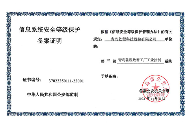 行业首家突破,保障安全发展2023-03-11乾程数智工厂工业控制系统的信息安全保护能力提升取得重大突破,通过了国家信息安全等级保护三级(简称等保三级)认证。这标志着乾程集团穿上了安全发展的“铁布衫”,成为...
